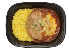 にんにくをきかせたピリ辛のペペロンチーノと完熟トマト※のソースをかけたハンバーグ※トマト・ピューレづけ、トマトペースト使用